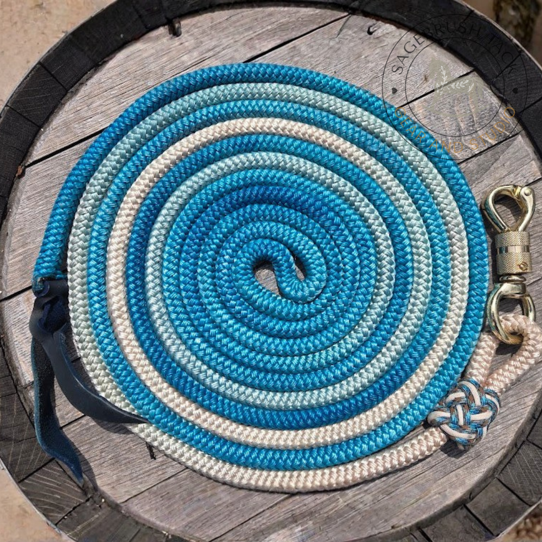READY TO SHIP 14ft hand-dyed turquoise lead rope with leather popper and twist panic snap...
