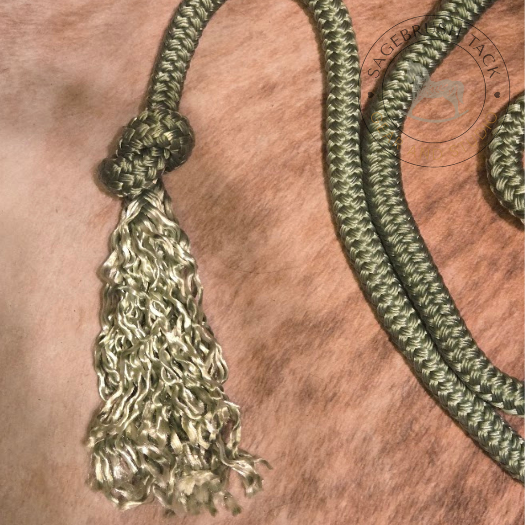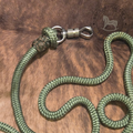 12ft 5/8" detachable moss green lead rope with brass twist panic snap, tassel, and army green paracord turkshead knot. The Twist Panic Snap offers a safer tying alternative than typical clips, and adds weight for better signalling.
