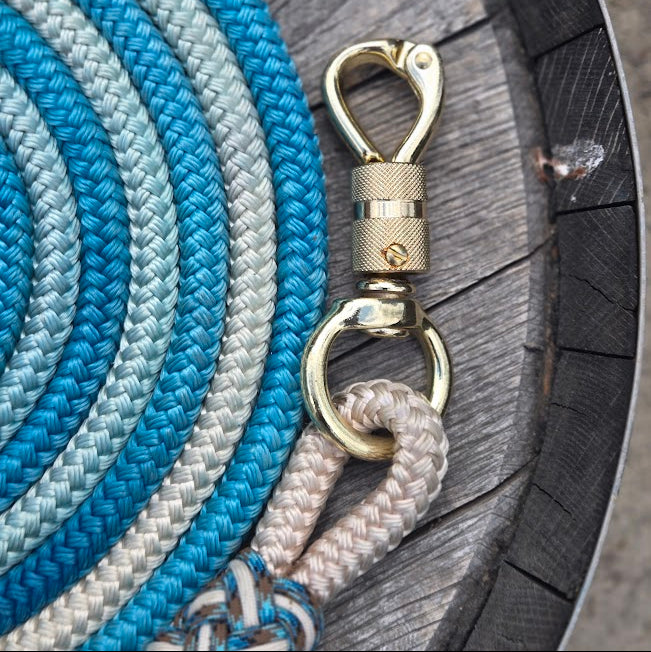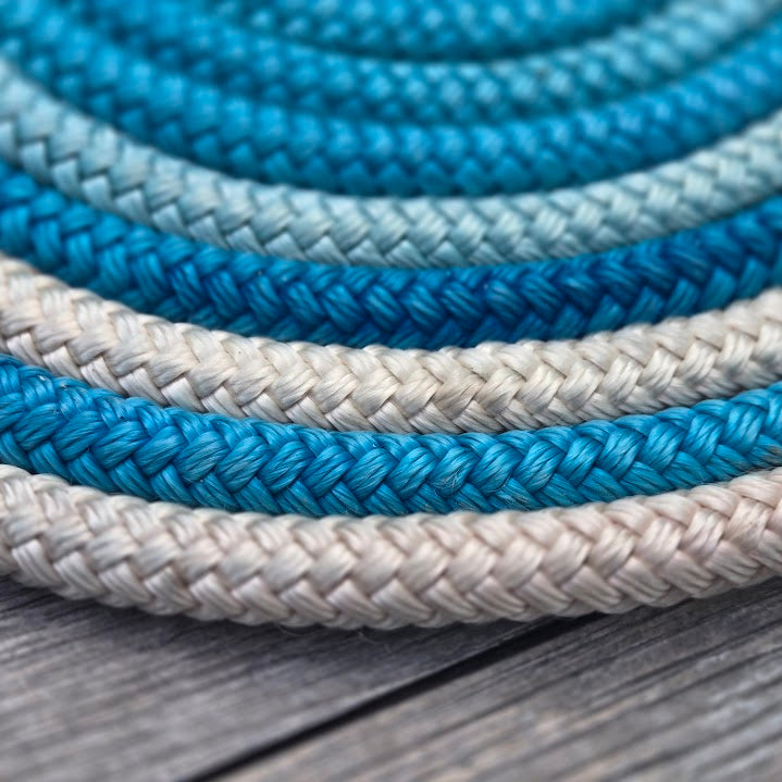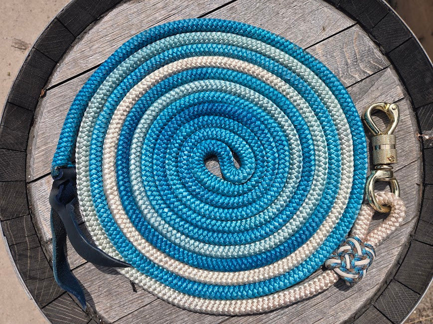 Dip dyed by hand by yours truly! 21 ft two-tone lunge line with twist panic snap. Tan and sky blue. Due to the hand-dyed nature of this item, it is one of a kind. There will never be another product just like it.