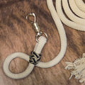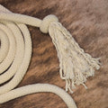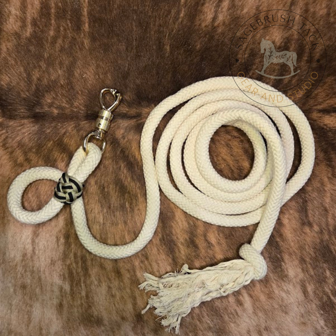 5/8" handmade 5/8" 12ft cream cotton lead rope with brass panic snap, tassel end, and black/tan paracord turkshead knot accent.