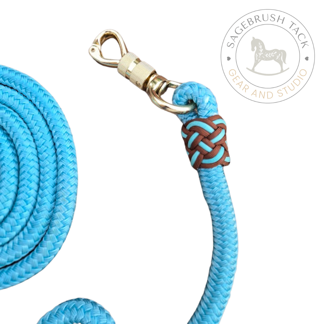 Custom hand-dyed yacht rope lead rope with your choice of length, colour, hardware, ends, and accents. This rope is made with 5/8" diameter double-braid yacht rope, which has an excellent feel favoured by many clinicians and trainers. While heavier than typical ropes used (which have a diameter of 9/16"), 5/8" ropes have extra weight to provide clear aids for groundwork and Natural Horsemanship-style training.