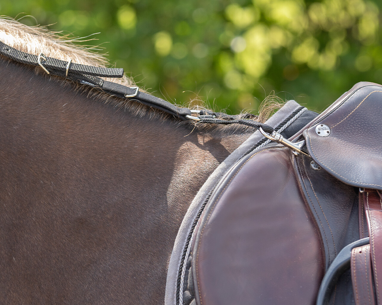 The Daisy rein prevents grazing while riding. The rein is widely adjustable and is easy to attach using the clip closures.