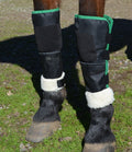 The unique design of this Knee Shield provides full coverage of the knee joint at all times. It doesn’t turn or fall down. The sturdy but comfortable cup is supported from below by a reinforced netting cone that allows for full air flow. They can be worn 24 hours a day, every day, if needed. They attach just above the fetlock joint with an elastic strap encased in fleece for a very comfortable fit. This strap is pulled just snug enough to not slip over the fetlock joint.