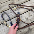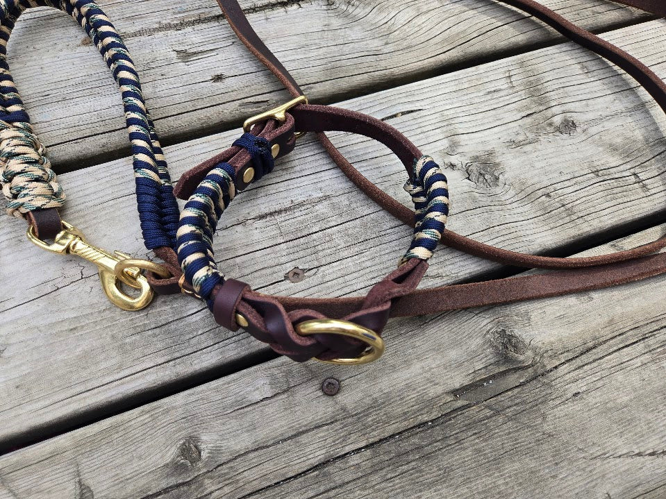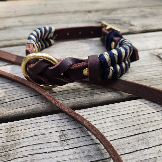 Crafted from premium oiled leather, this versatile set pairs a handcrafted collar with an 8ft double-ended leash designed to adapt to your lifestyle. The navy and desert sand paracord braiding, finished with bronze hardware, adds rugged style to every adventure.