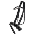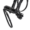 - Black leather bridle with a patent leather noseband, featuring a glitter edge