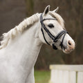 This black leather bridle features a patent leather noseband with a subtle glitter edge. The headpiece, noseband and the closure of the noseband are softly padded for extra comfort. The browband is adorned with heart-shaped rhinestones, giving the bridle an elegant look. The anatomically padded headpiece ensures a better fit and more comfort for your pony.