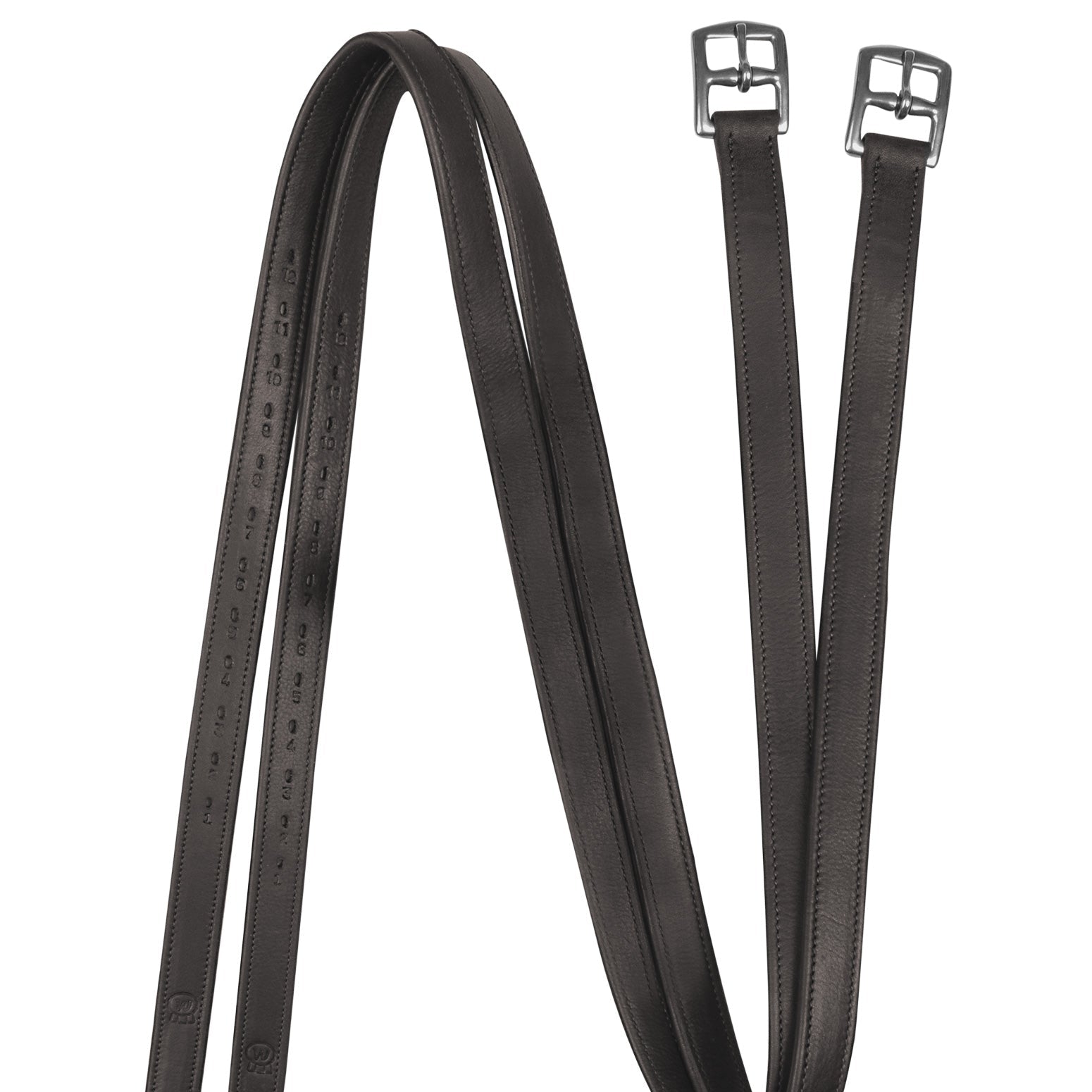 Stirrup leathers in soft, oiled leather with sturdy stainless steel buckle. The nylon inner core prevents stretching and unevenness.